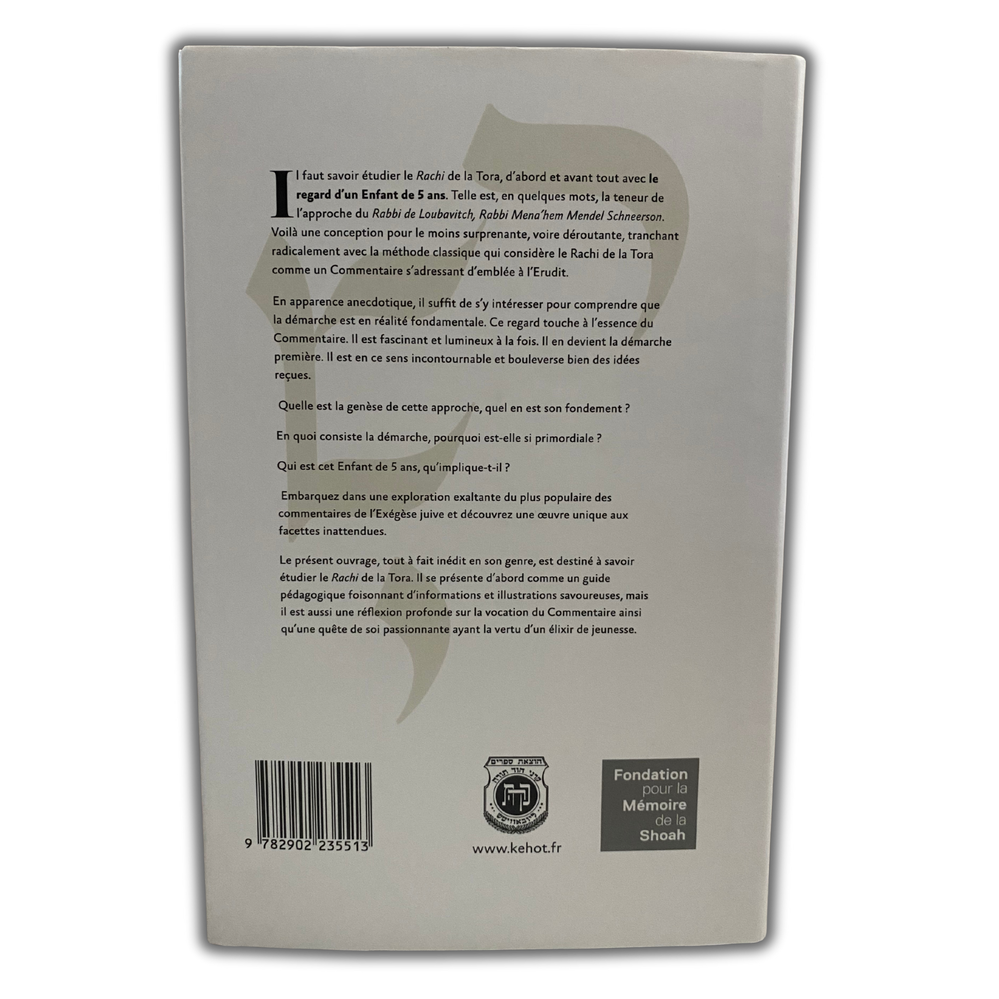Il faut savoir étudier le Rachi de la Tora, d’abord et avant tout avec le regard d’un Enfant de 5 ans. Telle est, en quelques mots, la teneur de l’approche du Rabbi de LoubavitchRabbi Mena’hem Mendel Schneerson . Voilà une conception pour le moins surprenante, voire déroutante, tranchant radicalement avec la méthode classique qui considère le Rachi de la Tora comme un Commentaire s’adressant d’emblée à l’Erudit. Embarquez dans une exploration exaltante du plus populaire des commentaires de l’Exégèse juive et découvrez une œuvre unique aux facettes inattendues. Le présent ouvrage, tout à fait inédit en son genre, est destiné à savoir étudier le Rachi de la Tora. Il se présente d’abord comme un guide pédagogique foisonnant d’informations et illustrations savoureuses, mais il est aussi une réflexion profonde sur la vocation du Commentaire ainsi qu’une quête de soi passionnante ayant la vertu d’un élixir de Jeunesse.