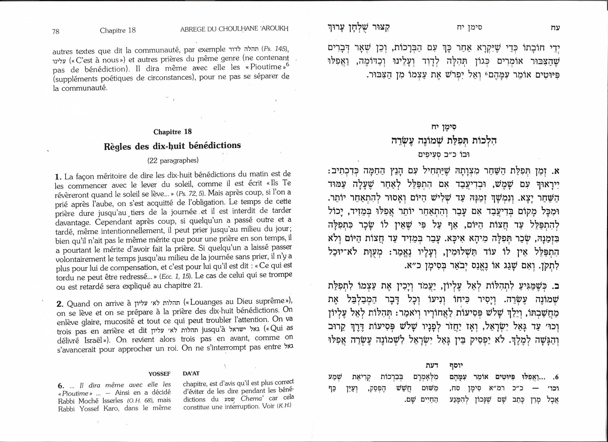 Le code essentiel de la pratique juive par Rabbi Chelomo GANZFRIED accompagné de « Yossef Da’at », observations et annotations, fruits d’une compilation savante, signalant ponctuellement sur la même page les usages Séfarades toutes les fois qu’ils diffèrent de la règle contenue dans le « Kitsour » classique exclusivement achkénase, par Rav Avraham ABRAHAM. Texte hébraïque ponctué et vocalisé, en regard de la traduction Française réalisée par les rabbins Adrien GUTTEL et Lionel COHN pour le « Kitsour Choulhane ‘Aroukh », le rabbin Isaac KAPETAS pour « Yossef Da’at ». Ces traductions ont été revues par Menahem PEREZ.